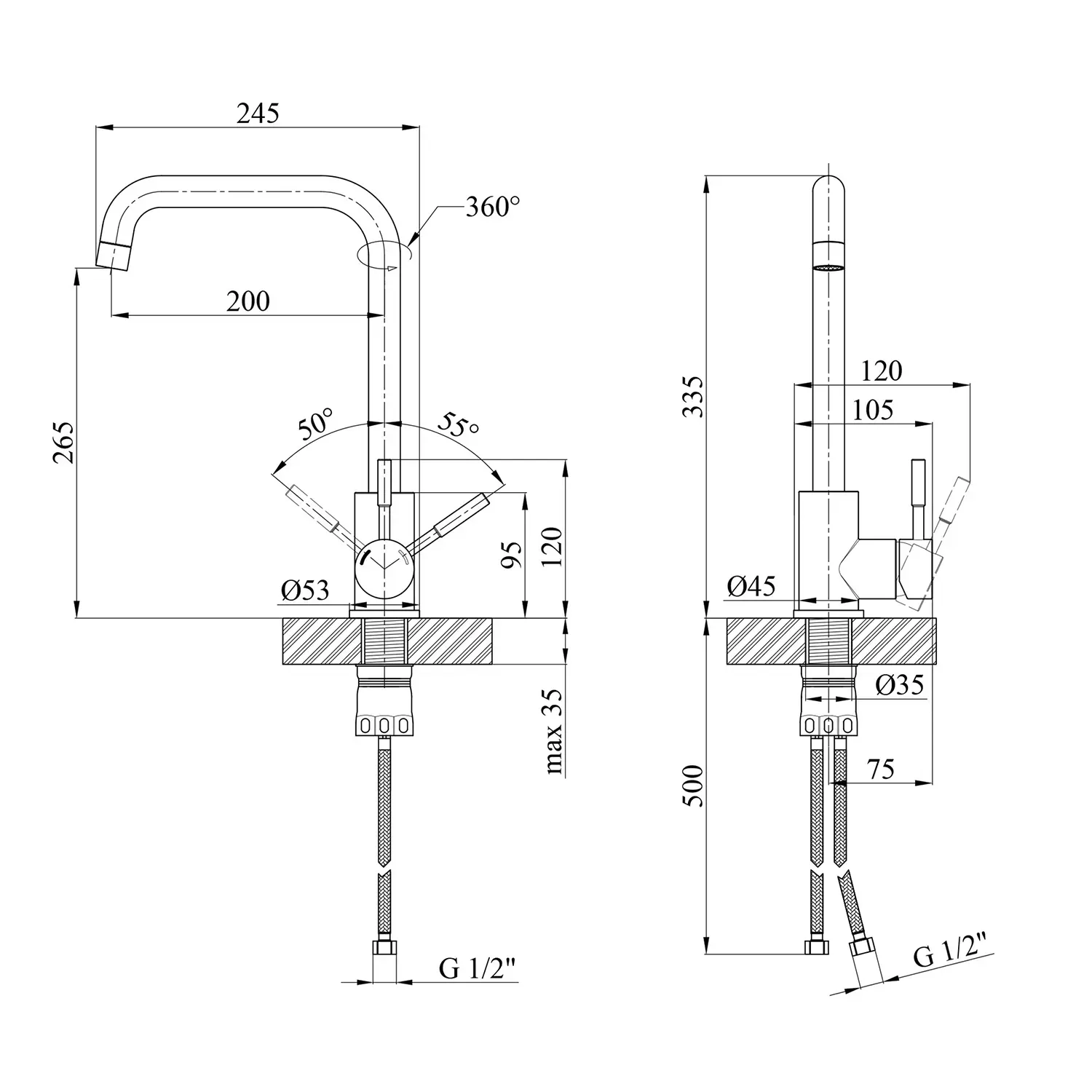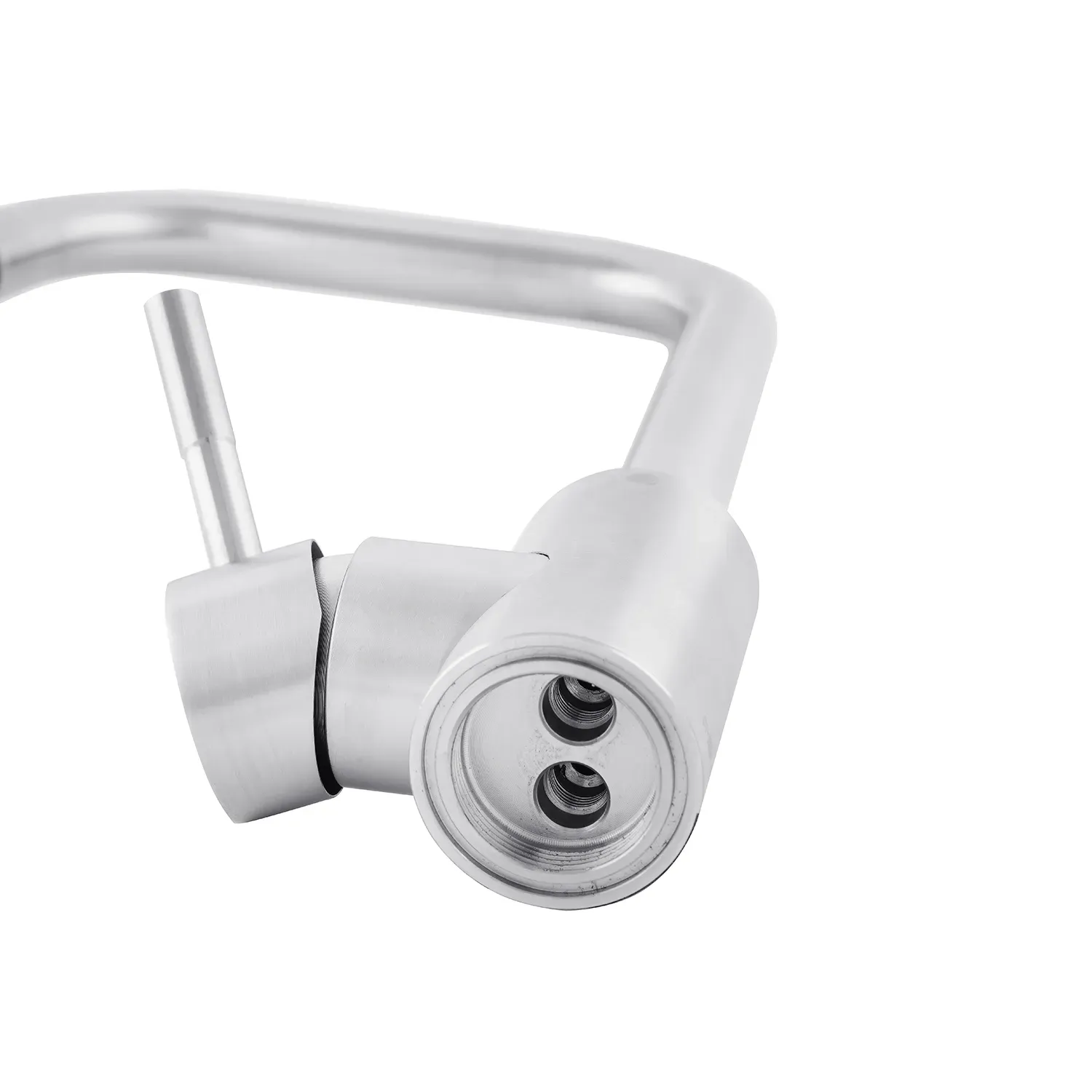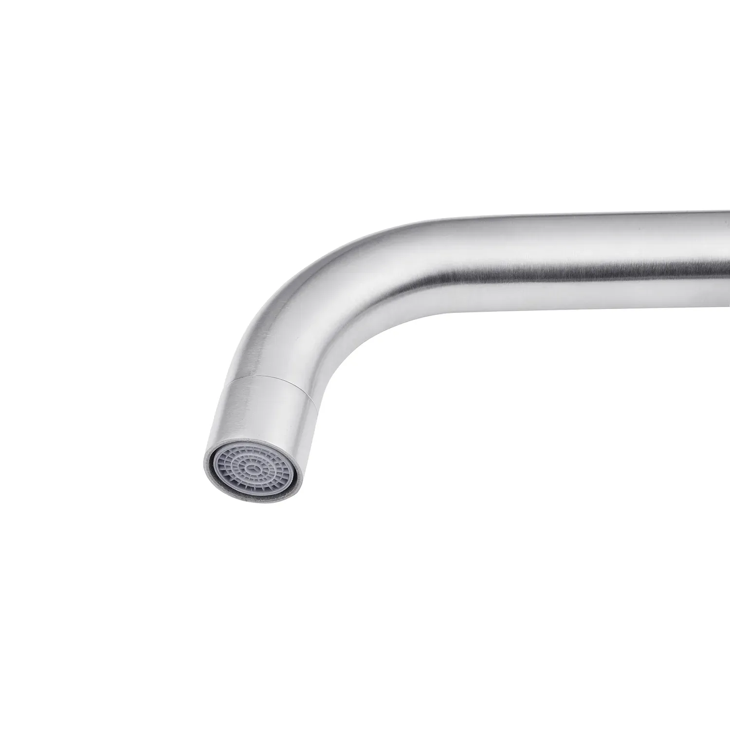 Кухонные смесители Kroner – это немецкое качество, технология и надежность. Современный дизайн станет успешным дополнением интерьера кухни. Изготовление из качественных материалов, не поддающихся коррозии, легкость в сборке не доставит хлопот при монтаже и использовании. Имеют поворотное излияние и устанавливается на одно отверстие с подводом воды с помощью гибких шлангов М10х1/2". Шланги для подключения входят в комплект. Данная модель изготовлена из нержавеющей стали AISI 304.