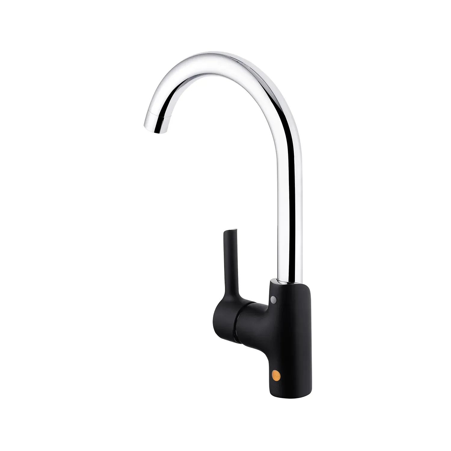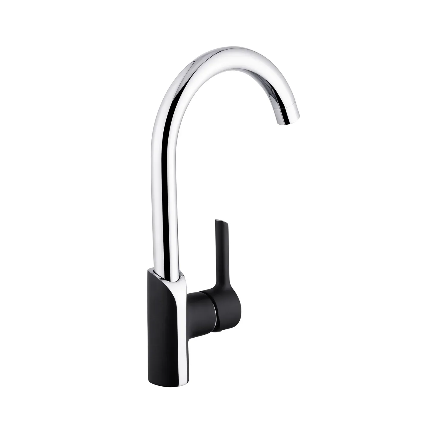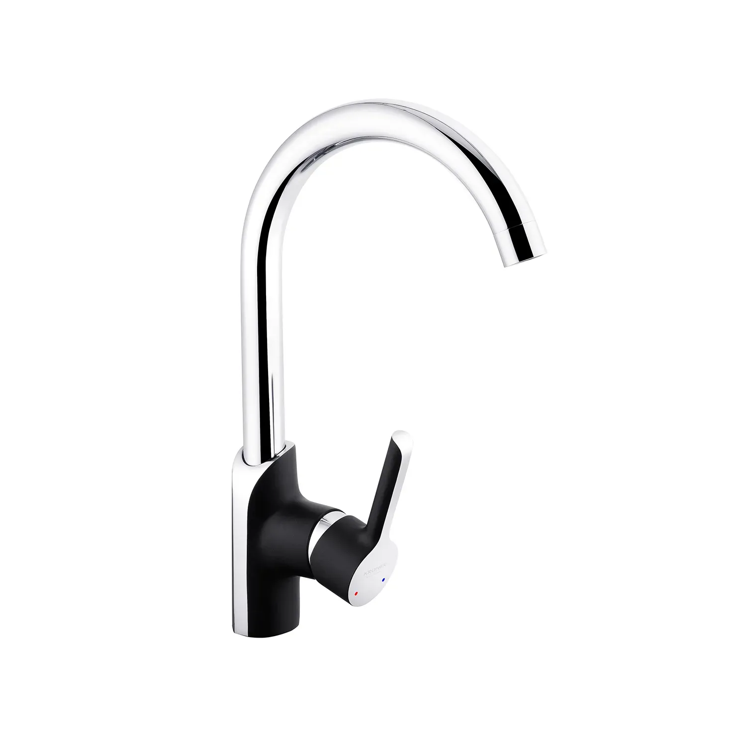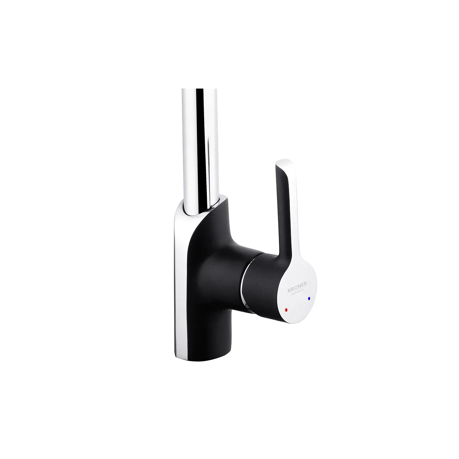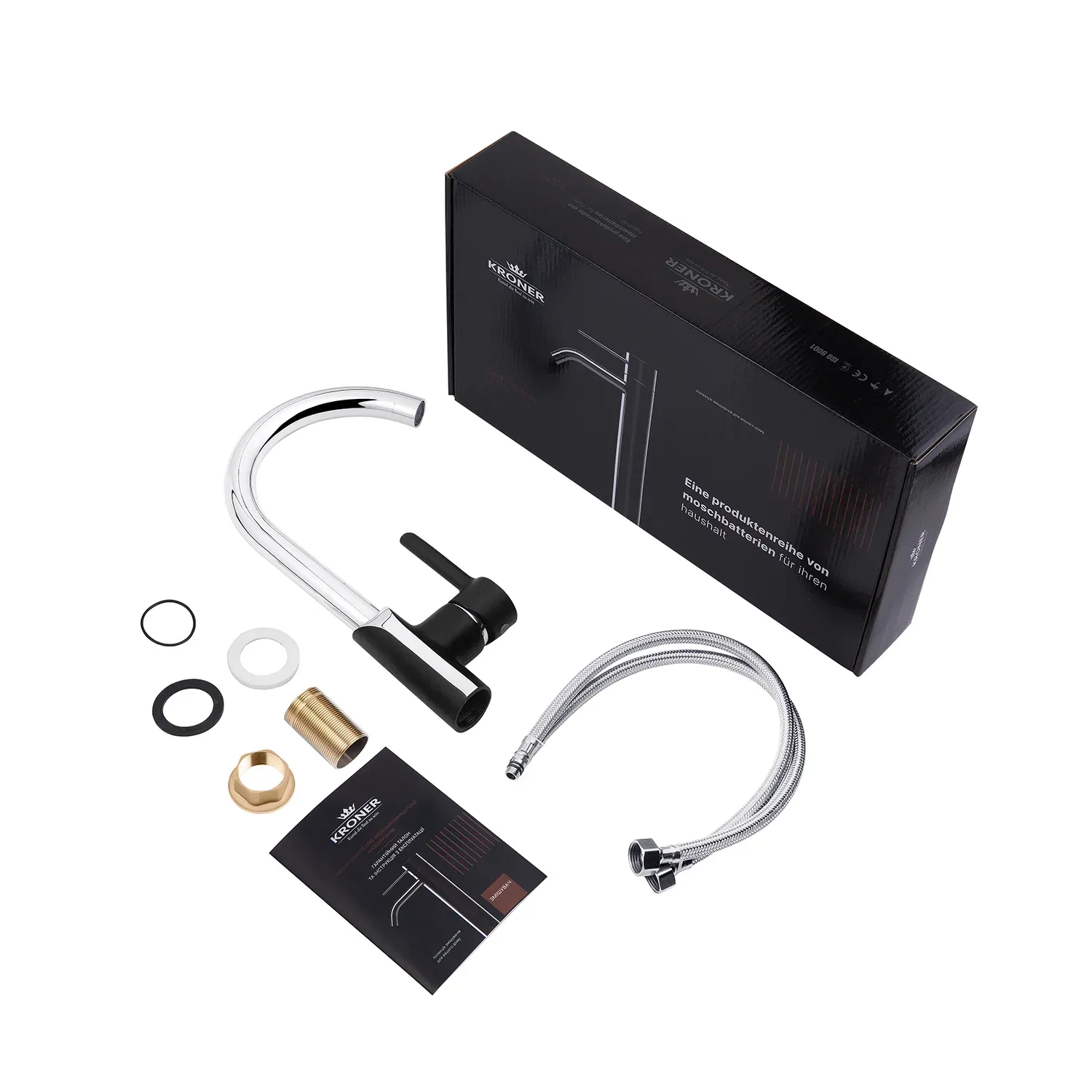 Смеситель для кухни Kroner KRP Essen – SCH030 – идеальный выбор для вашей кухни. Изготовлен из высококачественной латуни, гарантирует прочность и долговечность. Имеет привлекательную глянцево-матовую поверхность хромированно-черного цвета, что придает ему элегантность. Смеситель оснащен картриджным механизмом смешения, позволяющим удобно регулировать температуру воды. Его уникальная U-образная форма излива обеспечивает удобство при наполнении посуды или мытья продуктов. Наслаждайтесь функциональностью и стилем смесителя Kroner.