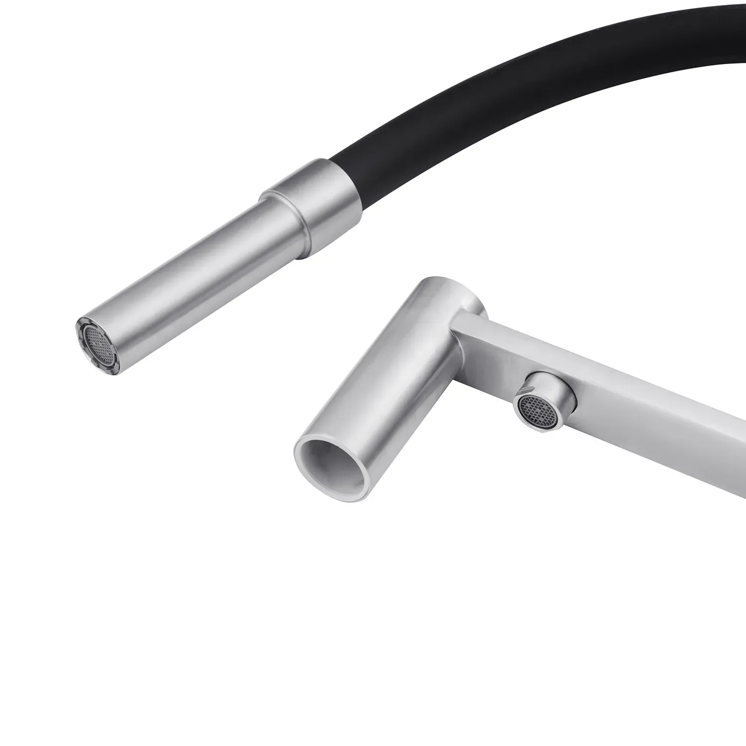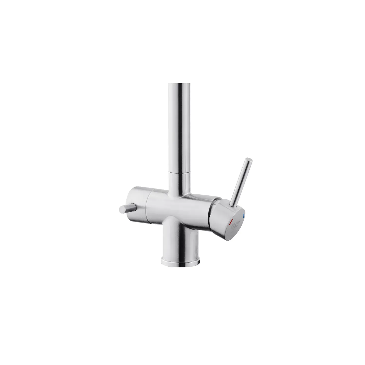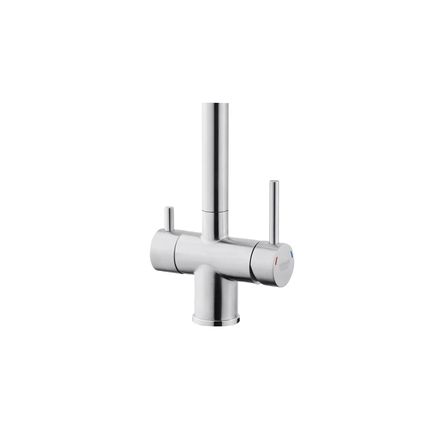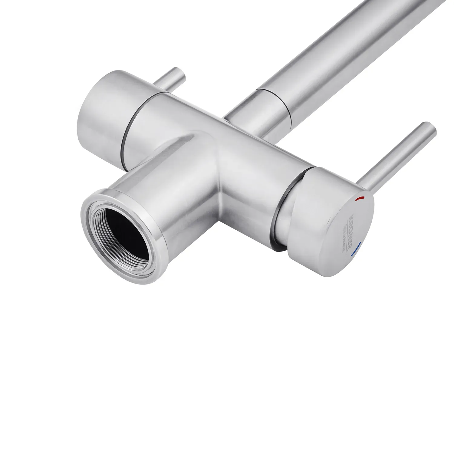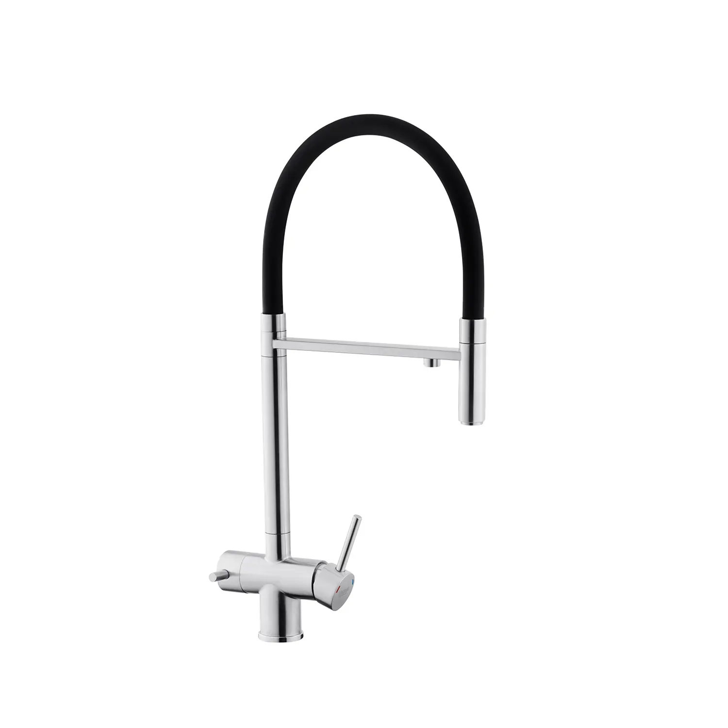 Смеситель для кухни с подключением к фильтру Kroner KRP Edelstahl Klassisch - ESG03815BLK изготовлен из высококачественной нержавеющей стали, которая не подвергается коррозии, устойчива к ударам и появлению трещин. Смеситель имеет U-образную форму с тремя контурами подключения воды. При участии первого и второго осуществляется подключение холодной и горячей воды, где смешивание происходит с помощью картриджа.