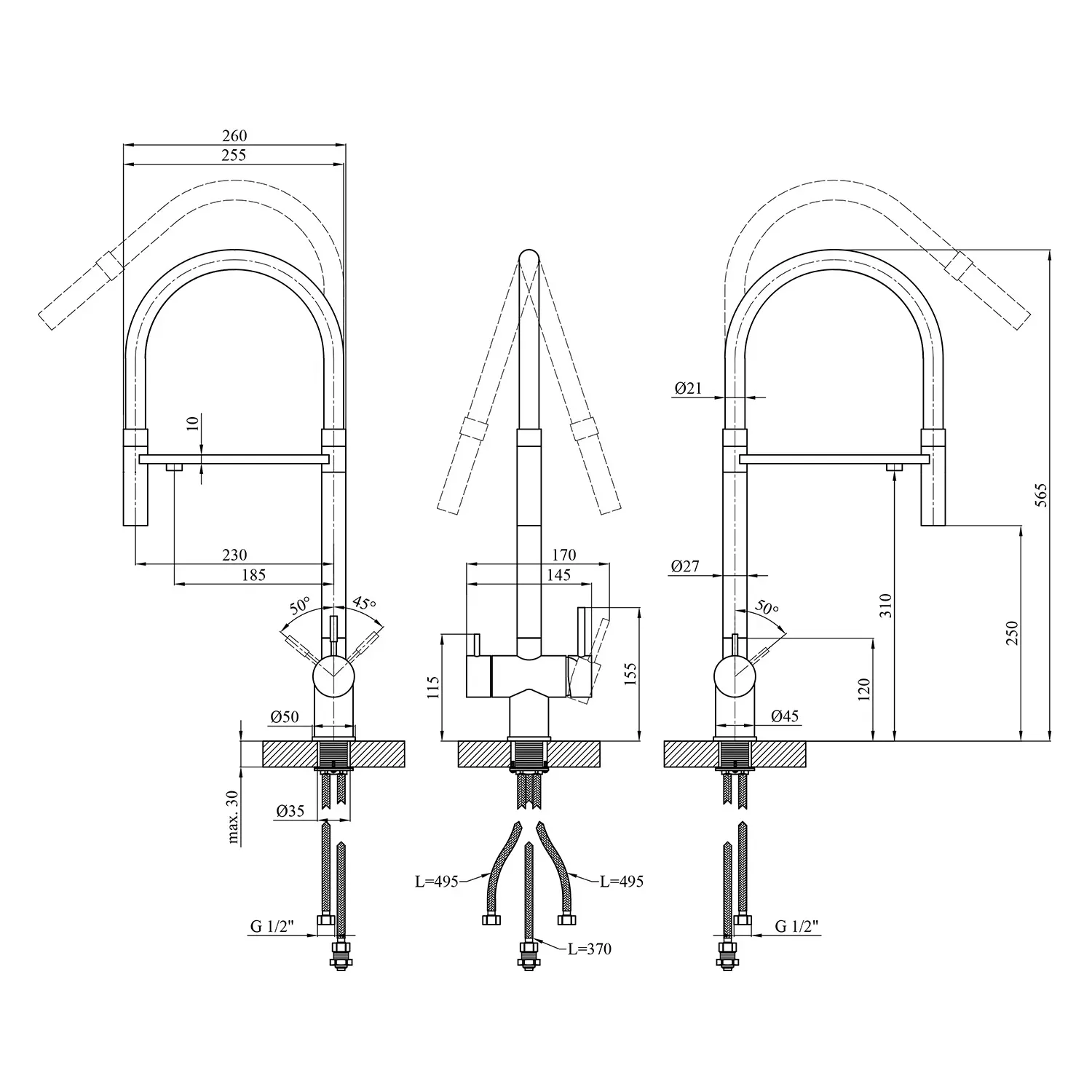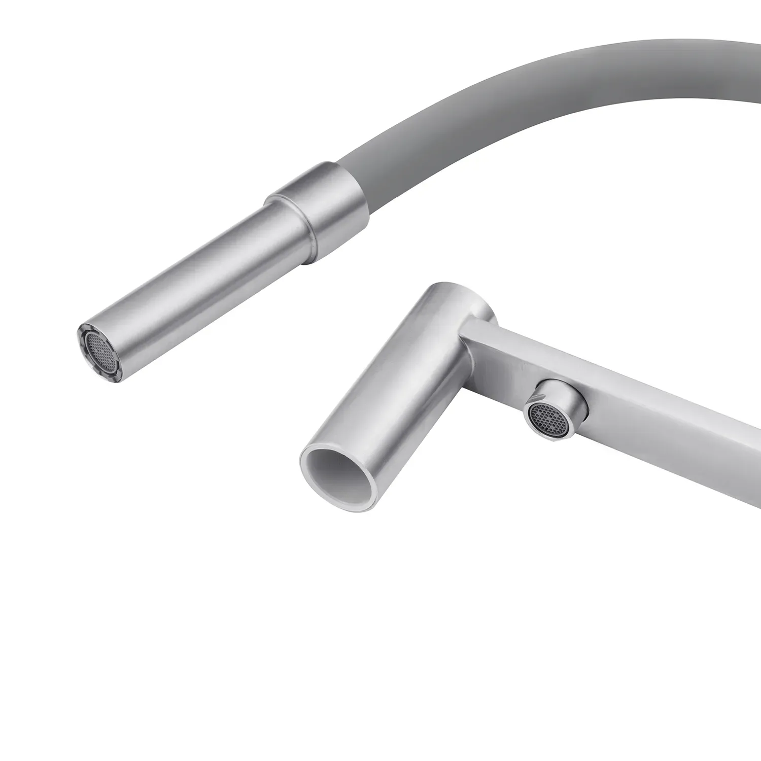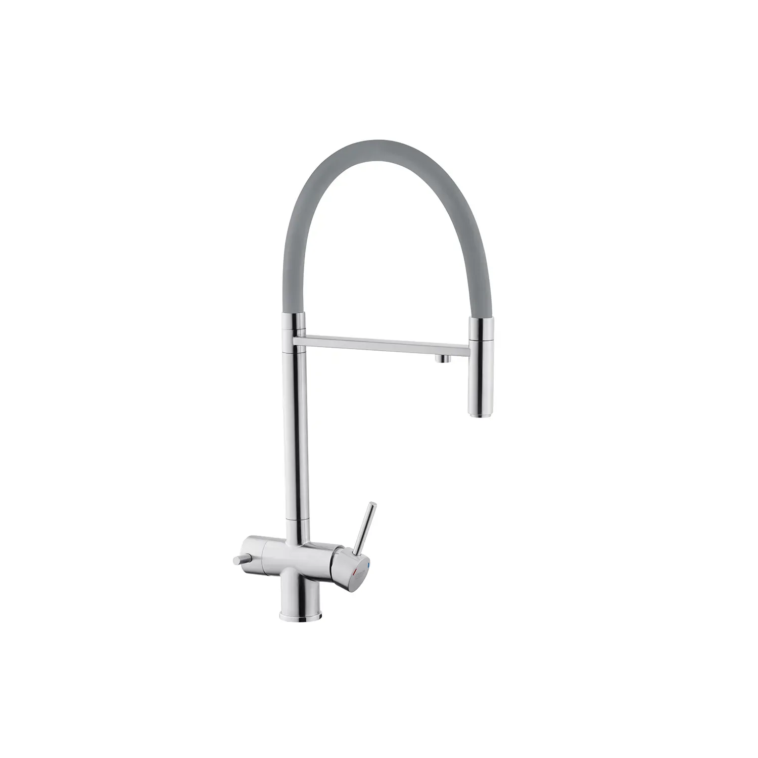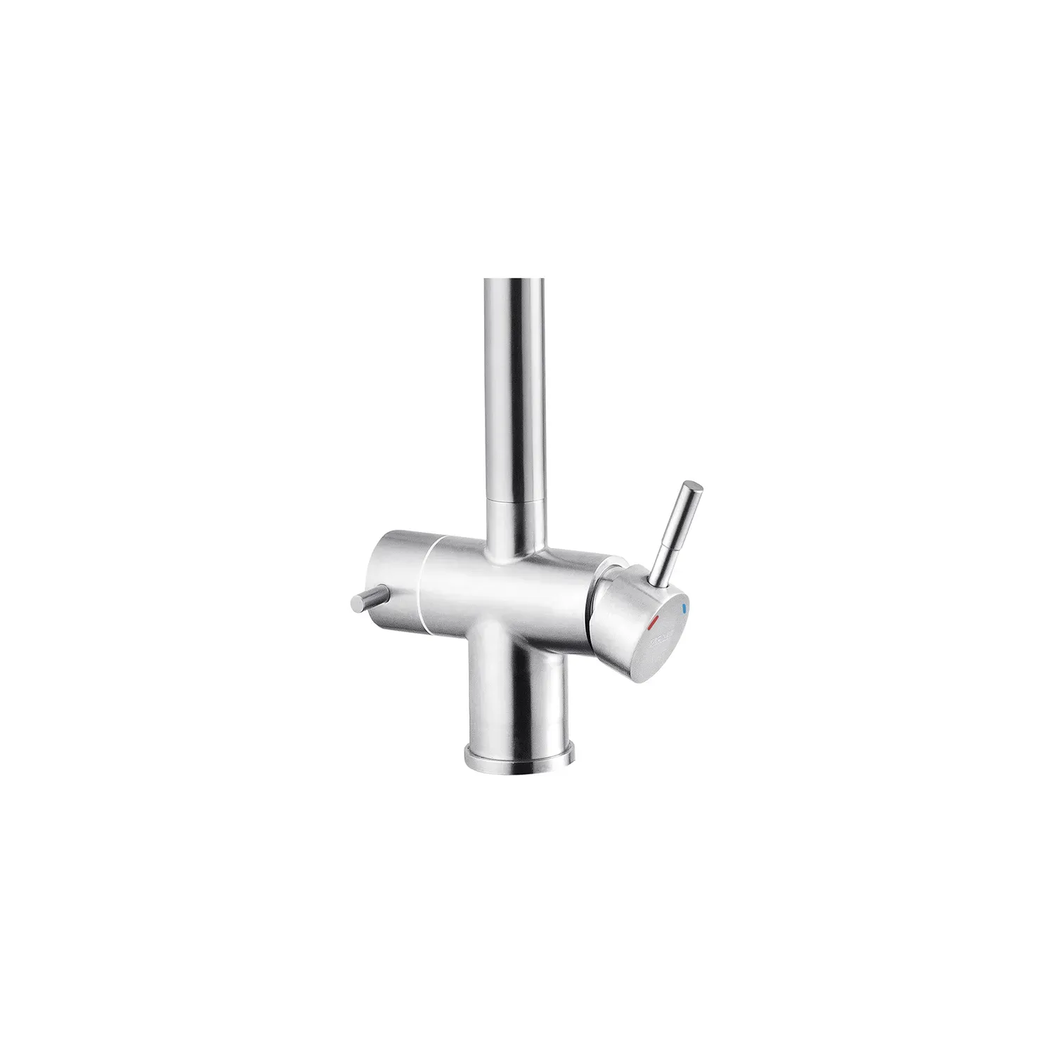 Смеситель для кухни с подключением к фильтру Kroner KRP Edelstahl Klassisch - ESG03815GRA изготовлен из высококачественной нержавеющей стали, которая не подвергается коррозии, устойчива к ударам и появлению трещин. Смеситель имеет U-образную форму с тремя контурами подключения воды. При участии первого и второго осуществляется подключение холодной и горячей воды, где смешивание происходит с помощью картриджа.