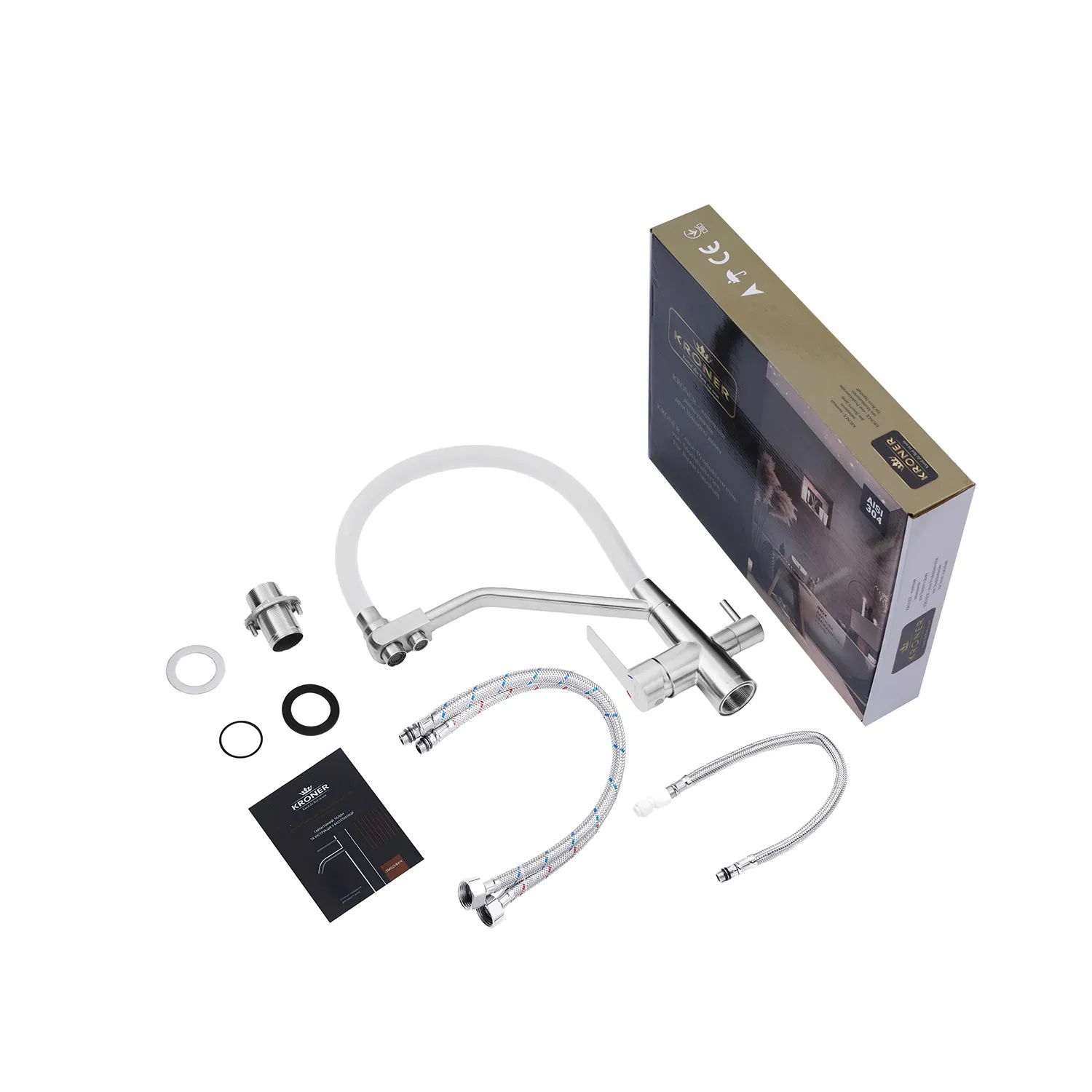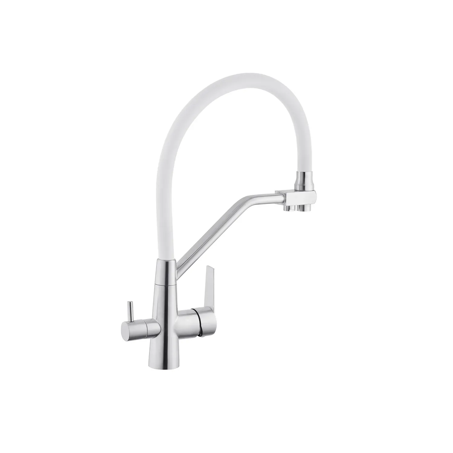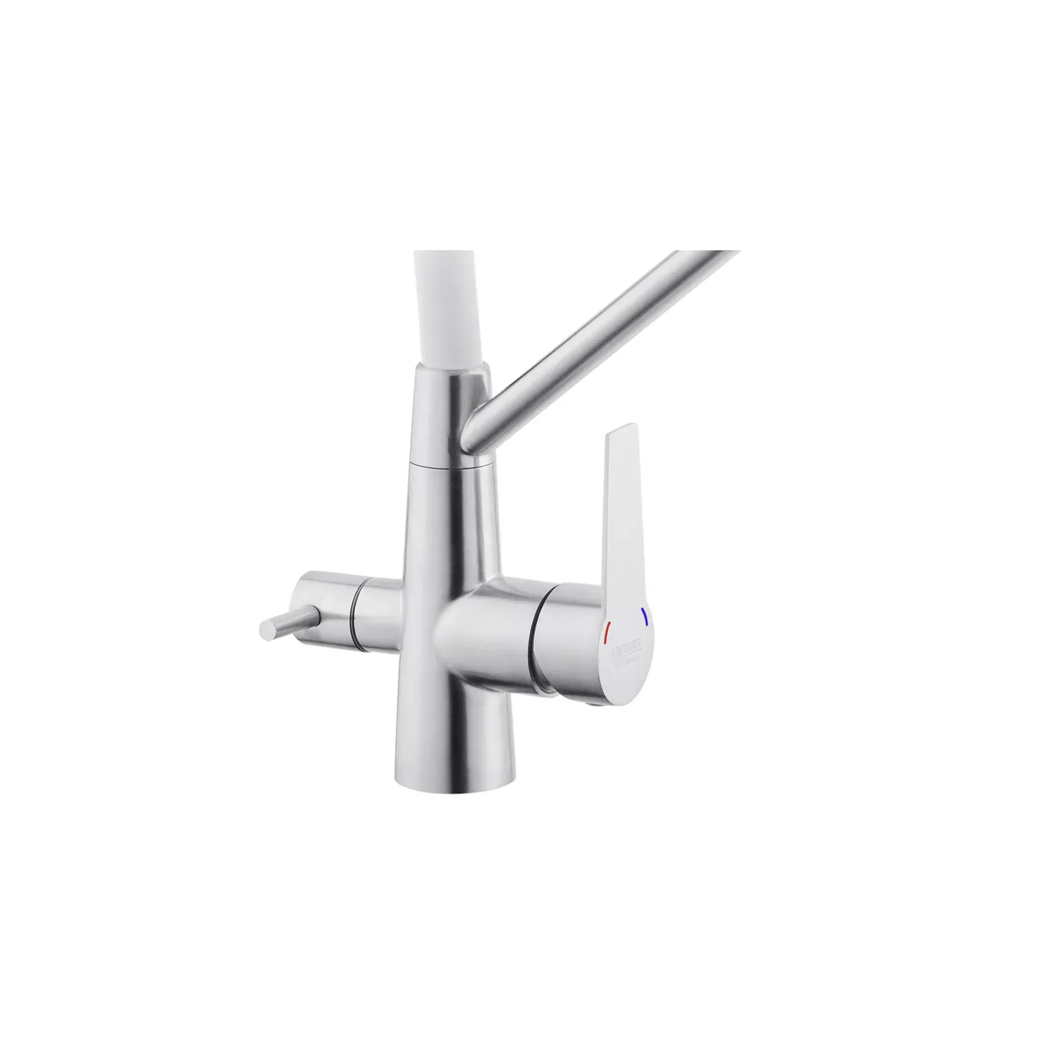 Смеситель для кухни с подключением к фильтру Kroner KRP Edelstahl Klassisch - ESG03817WHI изготовлен из высококачественной нержавеющей стали, не подверженной коррозии, устойчив к ударам и появлению трещин. Смеситель имеет U-образную форму с тремя контурами подключения воды. При участии первого и второго осуществляется подключение холодной и горячей воды, где смешивание происходит с помощью картриджа.