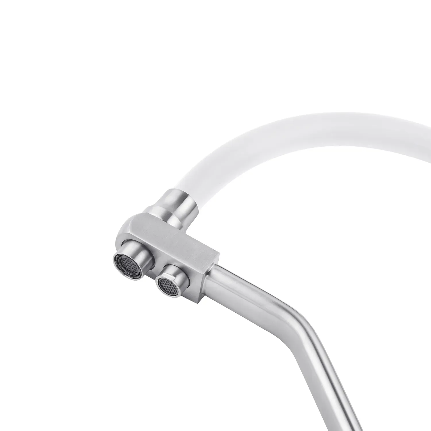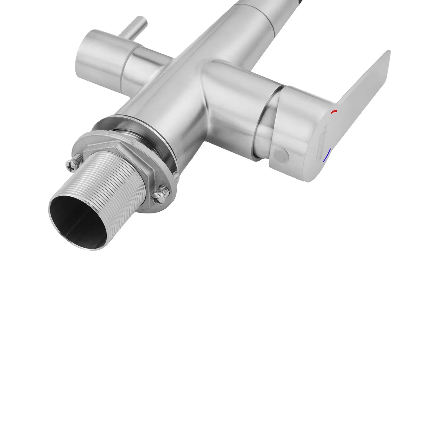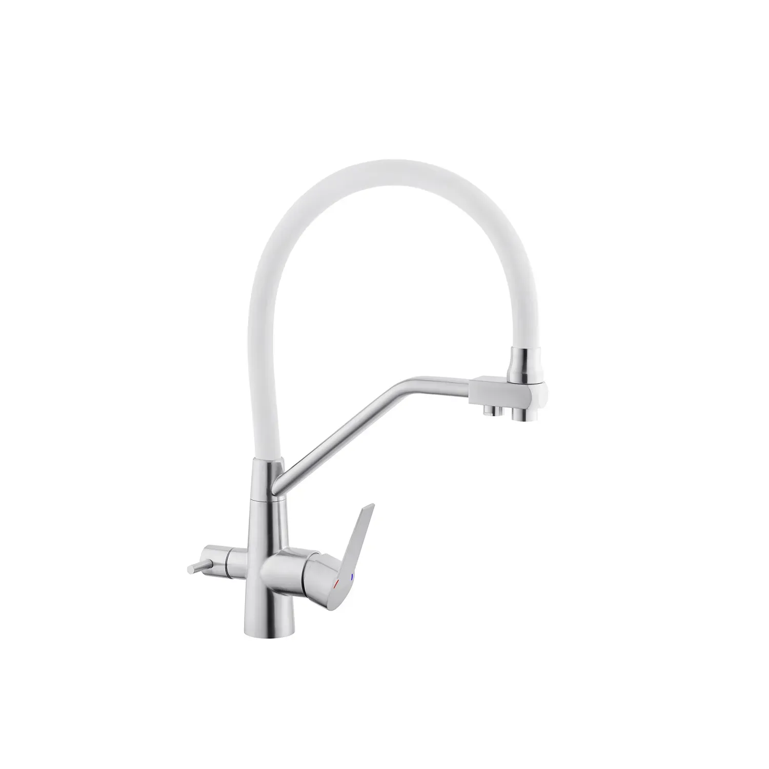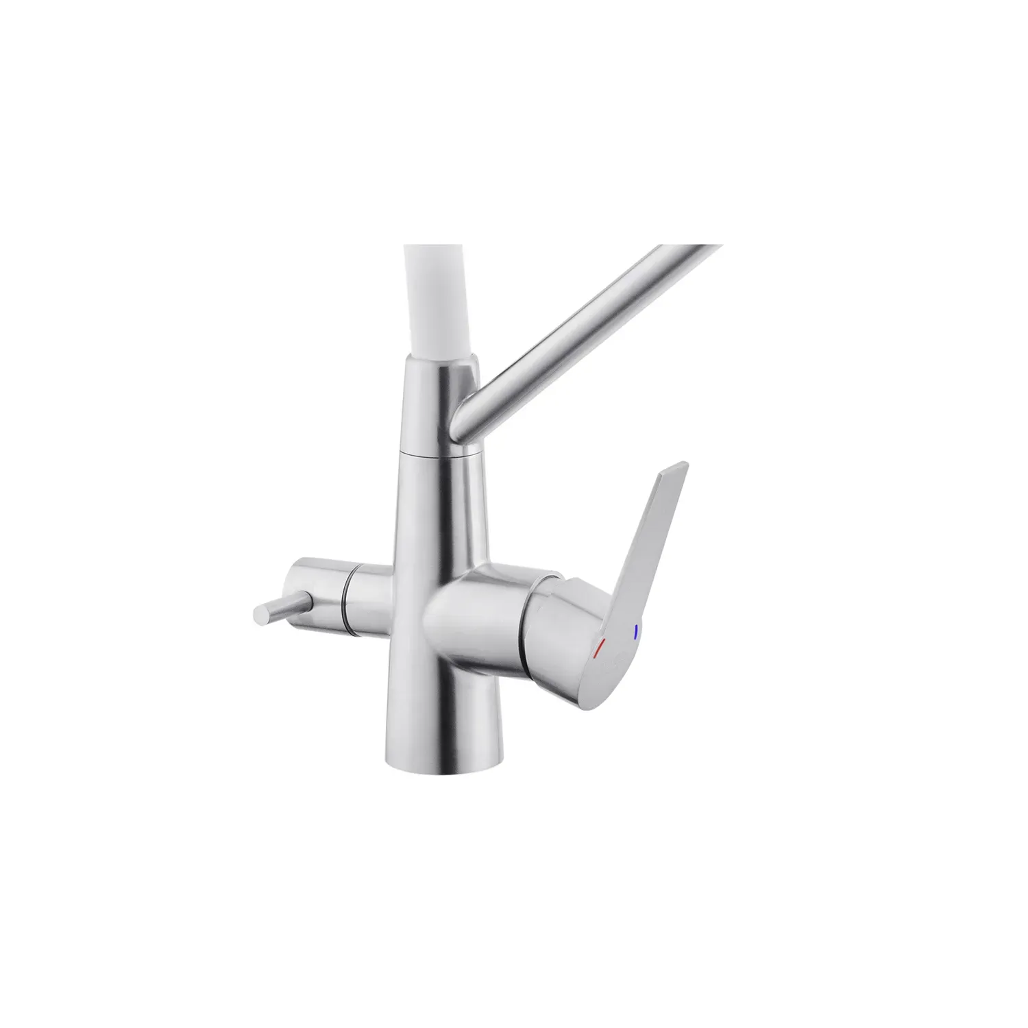 Смеситель для кухни с подключением к фильтру Kroner KRP Edelstahl Klassisch - ESG03817WHI изготовлен из высококачественной нержавеющей стали, не подверженной коррозии, устойчив к ударам и появлению трещин. Смеситель имеет U-образную форму с тремя контурами подключения воды. При участии первого и второго осуществляется подключение холодной и горячей воды, где смешивание происходит с помощью картриджа.