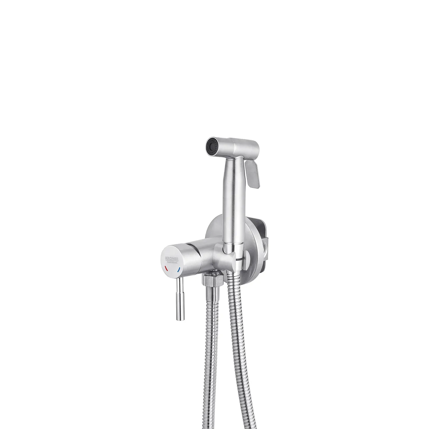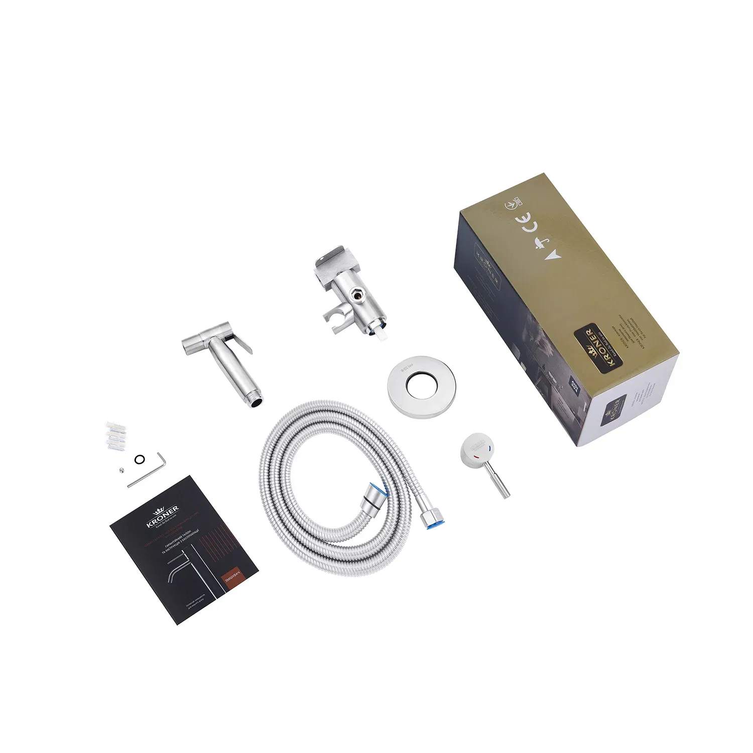 Гигиенический душ Kroner KRP Edelstahl Klassisch - ESG053 отличный вариант для реализации функции биде даже в небольшом санузле. Корпус изготовлен из пищевой нержавеющей стали SUS 304, что обеспечивает долговечность и безопасность эксплуатации изделия. Смеситель оснащен керамическим картриджем диаметром 25 мм, что обеспечивает плавную регулировку температуры и напора с помощью рычага. В комплекте ручная лейка с нажимной клавишей, а также все необходимое для скрытого монтажа.