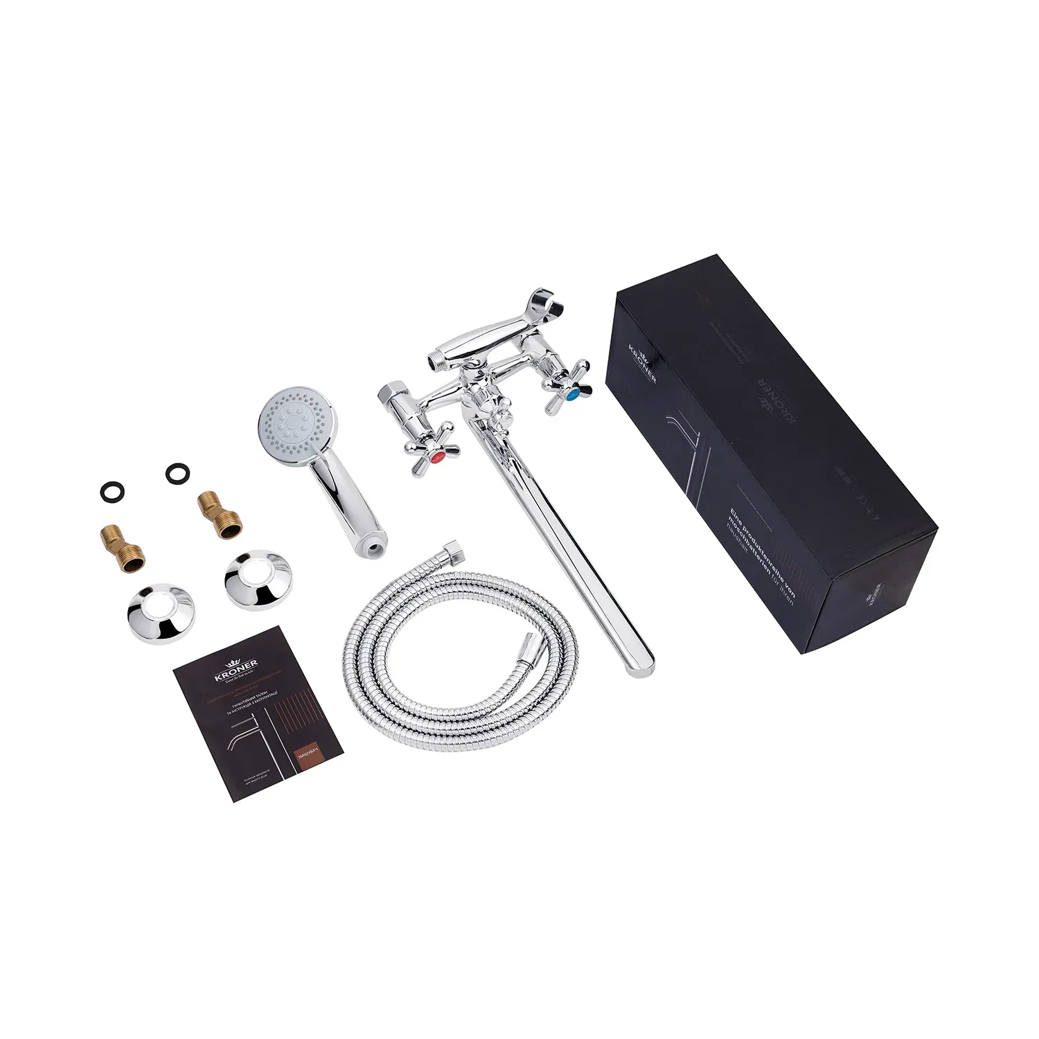 Смеситель для ванны Kroner KRP Royce - C072 с длинным поворотным изливом изготовлен из латуни, укомплектован душевым шлангом и воронкой. Благодаря хромированному покрытию имеет крепкую поверхность и привлекательный внешний вид. Для включения потока воды предусмотрено два вентиля. Для переключения на душ – дивертор. Настенный монтаж производится с помощью крепежных деталей, входящих в комплект. Декоративные розетки скроют все погрешности установки на отделке ванной.