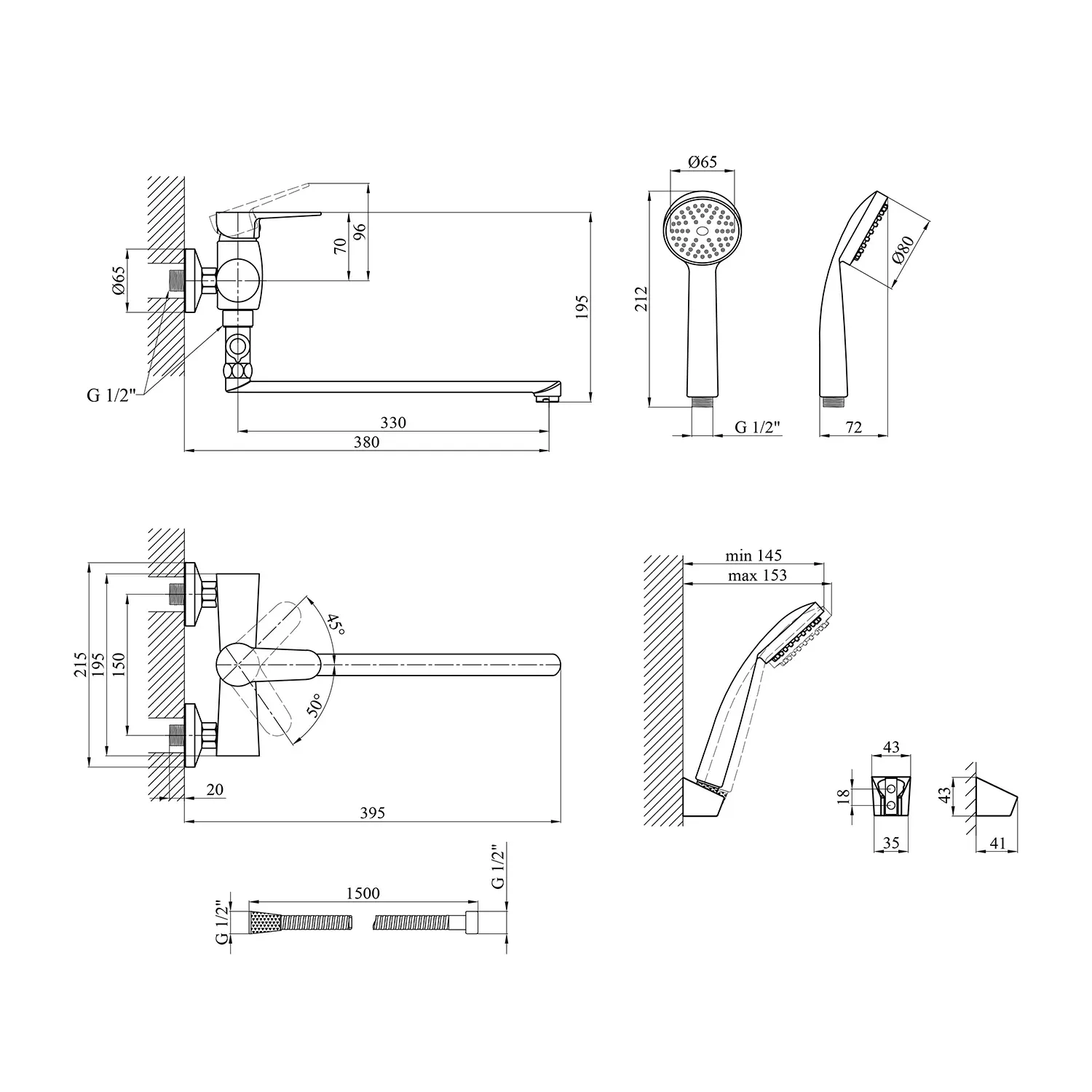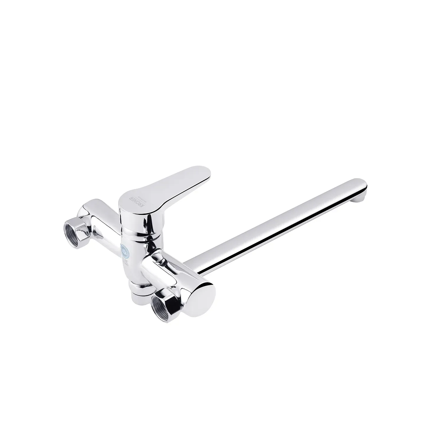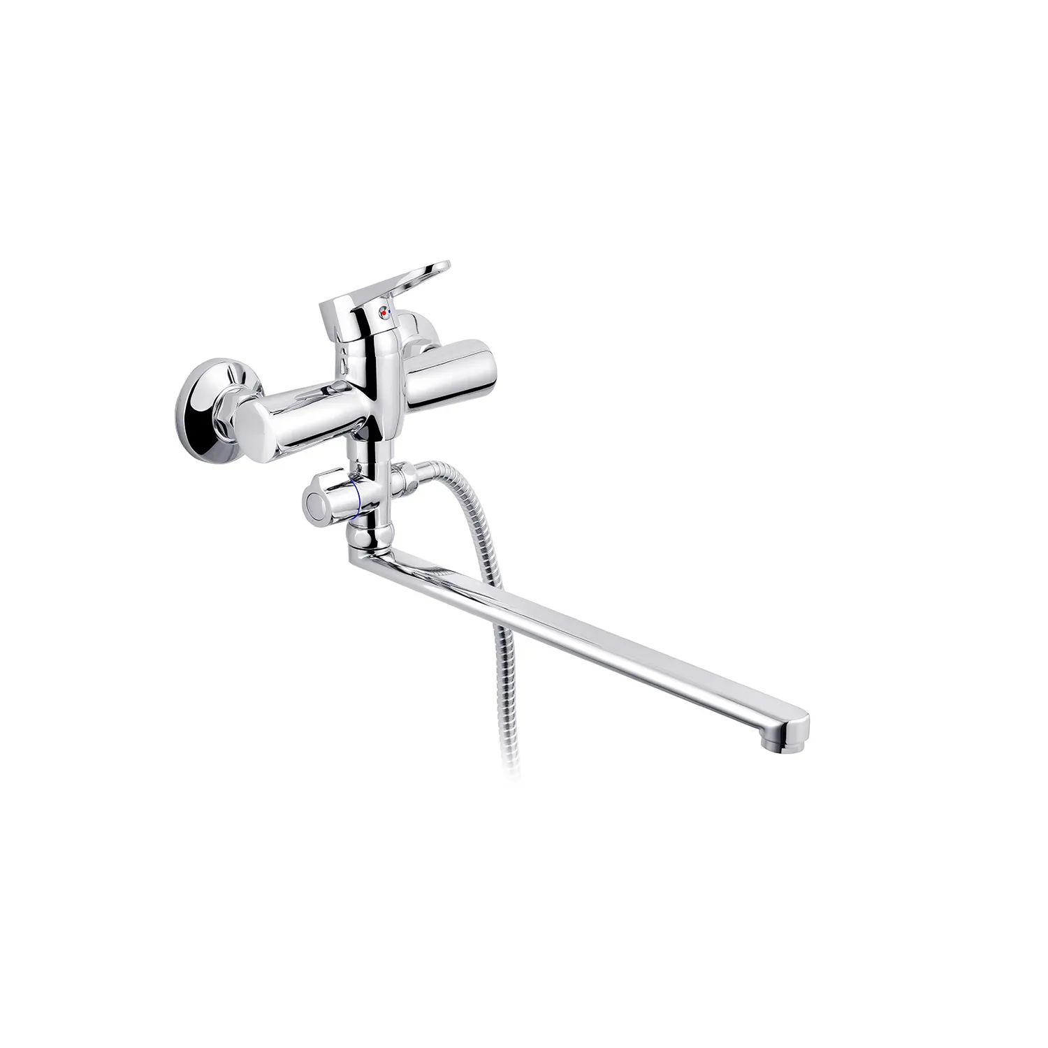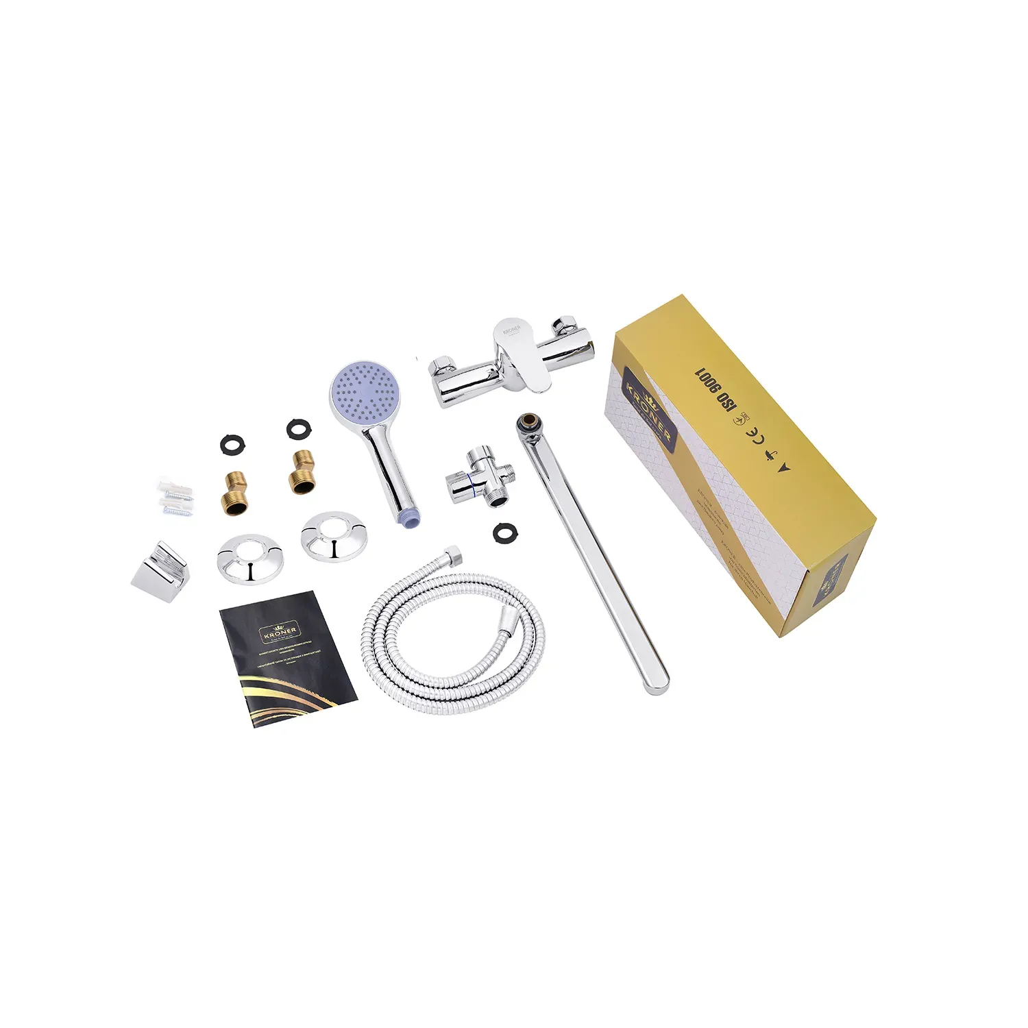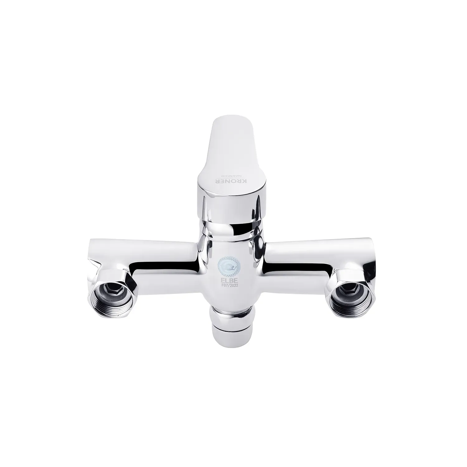 Смеситель для ванной Kroner KRM Elbe - C072 оснащен длинным поворотным изливом 350 мм и рычагом управления. Регулировка напора и температуры воды обеспечивает керамический картридж. Для приема душа есть гарнитур: душевая воронка диаметром 80 мм (1 режим), душевой шланг длиной 1500 мм и настенный держатель на 2 положения. Для переключения на душ/излив достаточно вернуть дивертор на 90°. В комплекте эксцентрики и декоративные розетки.