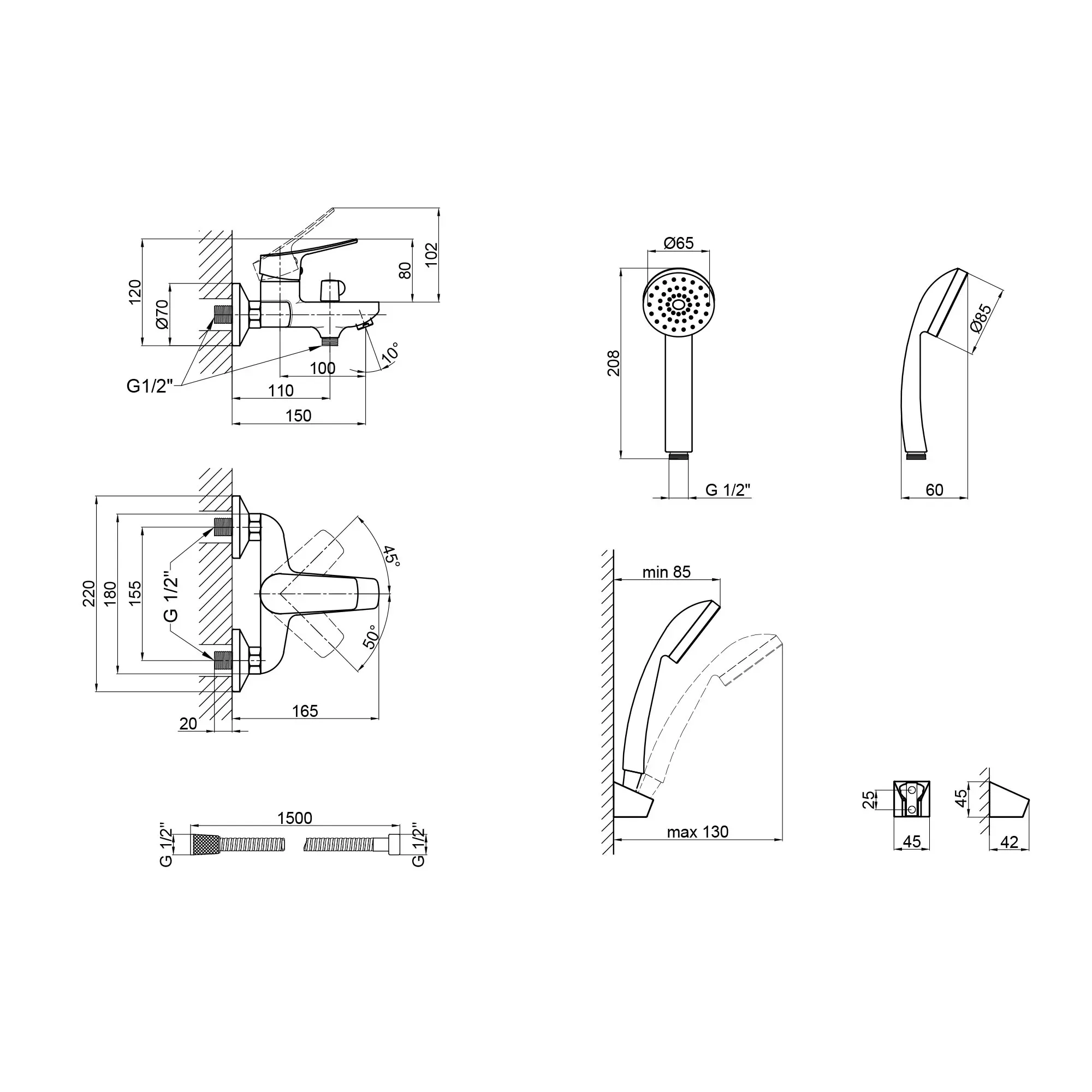 Комплектация: Смеситель, лейка для ручного душа, душевой шланг, кронштейн для ручного душа, крепежные детали.